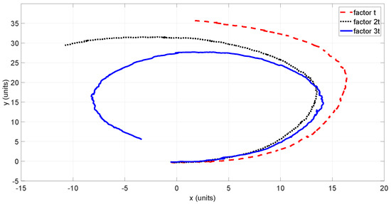 Steering behavior of the robot with different timing factors associated with the rotational matrix. The inner side leg stepping amplitude is reduced and at the same time the inner side wheg speed is decreased acting on the time-dependent rotational matrix .