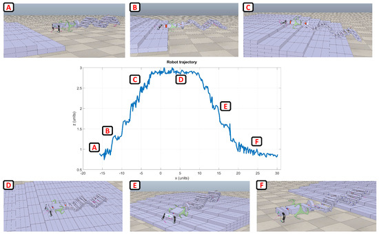 Trajectory followed by the robot in the x-z axis, during a climbing simulation with a stair-like obstacle. A series of snapshots illustrating the robot behavior is also included for different simulation steps.