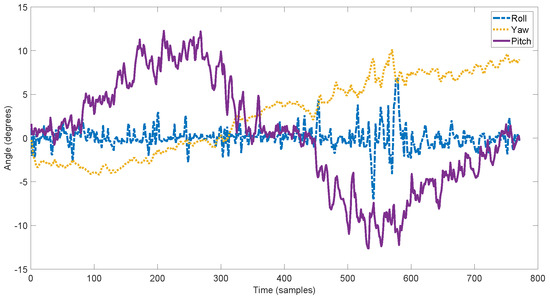 The stability of the robot can be also evaluated using the roll, pitch and yaw angles as reported in Figure 10. After climbing the direction of motion is slightly different from the beginning (i.e., yaw angle) but the presence of a GPS system together with an inertial module on board will help in re-orienting the robot for reaching the target location where the sensor board has to be deployed [57].
