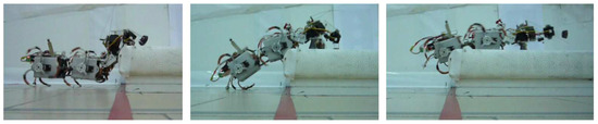 Therefore, in the presence of an obstacle higher than 8 cm, whegs are not enough to accomplish the overcoming task. In this situation the inclusion of the front manipulator is fundamental; in fact it allows the reaching of the top part of the obstacle with the robot arms. Using this system, the robot is able to overcome obstacles of about 11 cm (Figure 12). It has to be noticed that when the robot has to overcome a high obstacle, it risks falling down. To avoid this, changing the position of actuated joint is important in order to control the barycenter of the structure; this allows improved stability during climbing.
