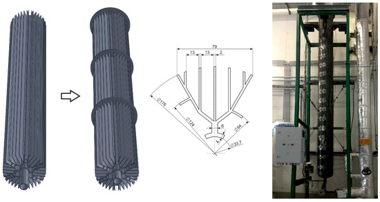 For the carried-out experiments, a storage test rig was designed and erected at the Institute for Energy Systems and Thermodynamic (IET) at TU Wien, as shown in Figure 1 on the right. As storage material, pure sodium nitrate was selected. The storage vessel is basically a vertical shell-and-tube-design heat exchanger. The inner HTF steel tube is equipped with aluminum fins; between the finned tube and the vessel shell 280 of PCM was filled in. The storage system is designed as a single tube system; the HTF inlet and outlet are positioned at the bottom and the top of the storage. The vessel has a height of where 3 is filled with PCM. The outer diameter of the vessel shell is 273 ; the HTF steel tube has a diameter of ; the aluminum fins are attached at the steel tube with hinged bolt clamps. Regarding the fins, both transversal and longitudinal fins are applied. The vessel is divided into five sections, within the sections the longitudinal fins are mounted, and the transversal fins mark the borders between the sections. The combination of both fin types is a remarkable novelty compared to former experimental investigations as it is displayed in Figure 2.
