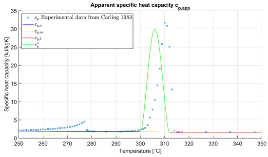 Furthermore, the apparent specific heat capacity is introduced. The apparent specific heat capacity is a combination of the specific heat capacity and the latent heat of fusion. It is possible to compare this function directly with physical measurements of the specific heat capacities and the latent heat of fusion. Differential scanning calorimetry (DSC) is the most common measurement method to determine these values, as described in [44]. Attention must be paid to the heating rate, as it has a direct influence on the determination of the melting temperature. Lower heating rates lead to more accurate melting temperatures; the heat of fusion and the melting point must be determined separately. Anyway, the result of such heat capacity measurements is a heat capacity function over time as provided in [45,46]. For the present model, the specific heat capacity is described with three functions.