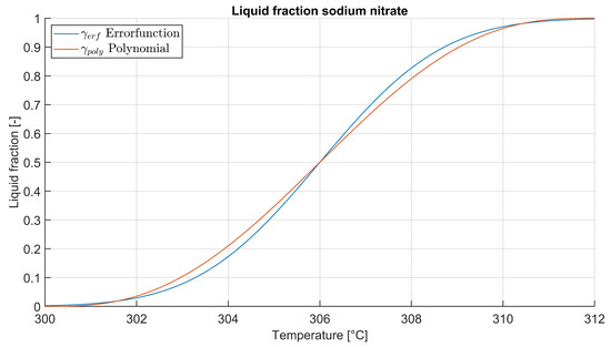 A comparison of the polynomial approach with the error function approach in [43] is provided in Figure 5. The liquid fraction applied for sodium nitrate shows a similar trend; the polynomial approach has slightly different gradients, compared to the error function.