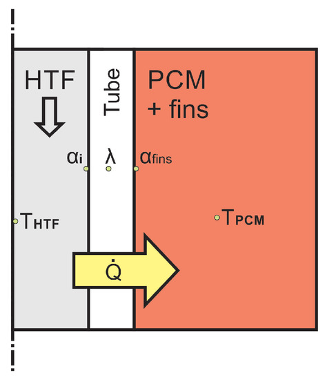 To describe the heat transmission from the HTF into the PCM, a scheme is presented in Figure 6. In the steel tube, the HTF temperature is measured at the inlet and the outlet . A mean HTF temperature can be determined. From the HTF to the steel tube, an inner heat-transfer coefficient was calculated as described in [48] for a flow in a tube, depending on the velocity and the HTF properties. For the experimental setup, the flow was turbulent with Reynolds numbers greater than 2300. The material properties of the HTF were taken from the manufacturer data-sheet [49]. The heat conduction in the steel tube can be calculated straightforwardly. For the heat transfer on the outer side of the steel tube, an apparent heat-transfer coefficient is introduced. It mainly depends on the fin geometry and the phase-transition state, which must be considered for the values provided in the results section.