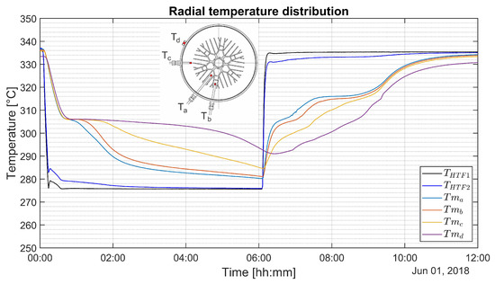 The temperature distribution in the PCM is measured in four mean radial positions (-). Figure 7 shows their temperature trend. From this data, a typical temperature trend for TES with PCM can be deviated, especially for discharging, which takes place from 0 to 6 . The temperature gradient at the melting temperature of the PCM ( 306 ) is zero; in this period, the phase change occurs at the specific measuring point. The phase-change time increases for the outer positions ( and ) due to more PCM mass. For charging, this effect cannot be seen so clearly, especially looking at positions and . A possible explanation for these results may be the stronger natural convection in the liquid PCM during melting in this region. It is possible that the finned area ( and ) limits natural convection, and therefore the melting point can be seen more clearly in this trend. This effect is supported by the results of numerical investigations in which fins hinder the flow of the liquid PCM [50]. The melting and solidification starts from the inside and moves to the outer shell. Interestingly, the process velocity differs, while for melting, the temperature converges to a stationary value after six hours. It is not stationary after six hours of discharging. The solidification process of the PCM takes more time than the melting, which confirms numerical simulation as in [29] and former measurements as in [23].