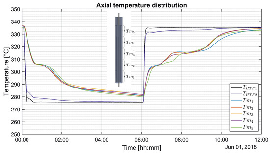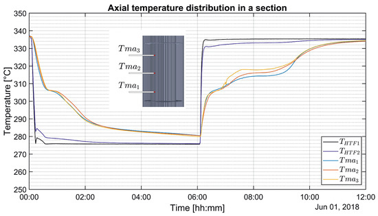 Another important finding is that the axial temperature distribution on a local level is different to the global axial distribution mentioned above. In each section, the temperature is measured in different heights and different radial distances. Therefore, in the position three measuring points exist in each section, for example is the middle one in the third section in the radial position a. Out of the five sections, the mean temperature for the three axial positions in one section were calculated and are presented in Figure 9. From the graph, it can be seen that the temperatures are mostly uniform beside the time from 7 to . In this period the PCM temperature is in a range of 306 to 325 and the PCM is in the liquid phase. Furthermore, the temperature gradient between the PCM and the HTF is high; hot and liquid PCM accumulates at the top of each section. Natural convection plays a non-negligible role in the heat-transfer mechanism during melting, as previously described by Walter in [29]. For solidification, the axial temperature distribution is uniform, heat conduction is the dominating and limiting factor for the heat transmission. However, findings of the current experimental investigation support the previous numerical simulations.