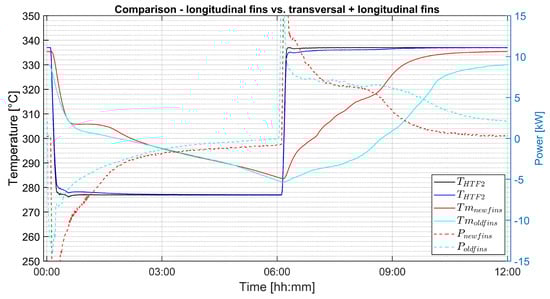 Turning now to the energy balance of the storage vessel, Figure 12 provides energy and power trends to compare the stored energy from an HTF-based perspective with an PCM-based perspective. The HTF temperatures at the inlet and outlet ( and ) together with the measured mass flow result in the power which is displayed as a black dashed line. Integration of the HTF-based power gives the energy, a black full line in the chart. The storage consists of the PCM, a steel vessel, and aluminum fins. Furthermore, losses will appear in the energy balance, based on the insulation thickness, storage temperature, and the cycle time. The temperatures for all components are measured, integrated over the time, and, together with the different enthalpies, the energy for the whole storage can be presented (, the red full line). This energy consists of the particular energy expression for the steel, aluminum, and the losses. Complying with the energy balance means that the red and the black lines are supposed to have the same trend and end up at the same value after a cycle. Interestingly, for charging, the two lines have a similar trend, and the deviation is low. For discharging, the trends show a higher deviation. The difference in energy between storage- and HTF-based calculations at the end of charging/discharging is relatively low for experimental investigations. Several limitations may affect the trend. One is the fault tolerance of the thermocouples in the HTF and the mass flow sensor. Another one is the limited radial temperature resolution to four sensor layers ( to ). Therefore, the temperature distribution in the PCM is probably not detailed enough. The PCM-stored energy is the biggest share, so the PCM temperature has a significant influence on the energy. Steel and aluminum masses do not play a huge role in the energy balance and the losses mainly depend on the insulation thickness. For a more detailed picture, the PCM temperature distribution must be measured with a higher resolution—more radially distributed thermocouples.