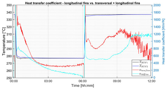 The heat transmission from the HTF into the PCM or the reverse can be split up into different sub-areas and effects. In the HTF tube, the heat-transfer coefficient from the fluid to the wall depends mainly on the fluid velocity and material properties. For the steel tube, heat conduction normally is high compared to the PCM. On the outer side of the steel tube, an apparent heat-transfer coefficient can be determined. This parameter is valid for the specific geometry and material combination and is presented in Figure 11. In the chart, the apparent heat-transfer coefficients for the two different fin geometries are compared. It can be seen that the value for the new fin type is significantly higher than the other one, especially in the more important first three hours of charging and discharging. As can be seen in Figure 10, the mean storage temperature for the new fins and charging approaches an asymptotic temperature after 9 . That means that the storage is almost charged after half the charging time. The temperature difference between inlet and outlet becomes small and the values for spread, as can be seen in Figure 11. Summing up, the heat-transfer coefficients are essential for the duration of charging and discharging but not for the asymptotic steady state.