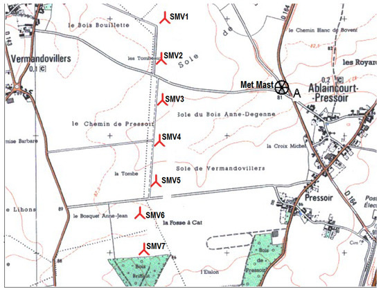 The free-stream wind characteristics (speed and direction) are provided by 80 m tall lattice met masts with ultrasonic anemometers installed at 80 m (same height as the turbines) above ground level. The met masts are located 1 km east of SMV2 and 1.6 km north-east of SMV6.