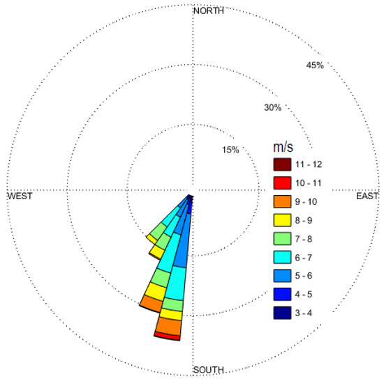 The optimised for SMV6 is within a range of ° as will be discussed in Section 4.2. However a fixed was applied on SMV6 for wake analyses during the experiment due to the operational constraints. For ten days, SMV6 was operated with a yaw offset of ° (clockwise) with respect to the wind direction, whenever the wind blew from 180°–220°. Subsequently, the yaw offset for SMV6 was set at 8° (anticlockwise) for four weeks, for the selected direction sector. The windrose in Figure 3 shows the actual wind conditions during the experiment, when the yaw offsets were applied on SMV6. The yaw offset range of ° to ° is selected given the operational limitations of the wind turbine.