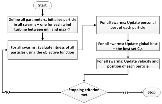 PSO is used along with a Turbulence Intensity based Jensen Model (TI-JM) for estimating the optimal yaw offsets [23]. Yaw offsets were initialised within a range of (−15°, 15°) as the implementable yaw offset range was (−12°, 8°) as discussed in Section 4. By adding the yaw error, the range extends beyond this (−12°, 8°).