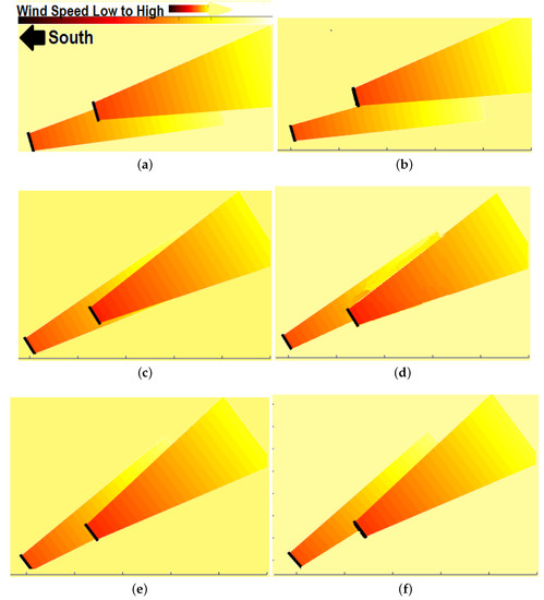 The wake expansion is determined using the wake decay coefficient of the standard Jensen model. Wake expands linearly behind the wake producing turbines starting with a radius equal to the blade length. Wake expansion is directly proportional to the distance from the wake producing turbine. The standard wake decay coefficient of 0.07 [32], for the type of terrain SMV has, is used in calculations. This standard wake decay coefficient was evaluated using real-time data and was found to be the best fit for the experimental setup as discussed in [1]. The wake skew angle () is determined using Equation (1) [33]. This relationship (Equation (1)) is validated using scaled wind farms and real time data in [34]: