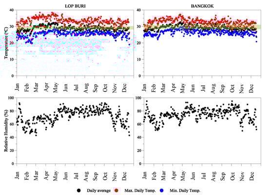 In contrast with the upper region, which has high temperatures and a long warm period, the lower region has milder temperatures and higher humidity, as well as less diurnal and seasonal temperature variation [46]. Figure 1 shows the daily average, minimum and maximum temperatures, and average relative humidity recorded in 2017 at two measuring stations located in Bangkok (13°45′09″ N) and Lopburi (14°48′00″ N), ±150 km northeast of Bangkok. The recordings indicate that there are only small seasonal temperature variations, with the temperatures being highest during April–May. Note that Bangkok has slightly lower annual temperatures but higher humidity than Lopburi, as Bangkok is located at a lower latitude and close to the Gulf of Thailand. The green shading in the figure indicates average underground temperatures recorded in observation wells [36]. It is also important to note that there is almost no difference between the annual average temperature and ground temperature. However, Bangkok has a slightly higher underground temperatures with a wider range compared with Lopburi.