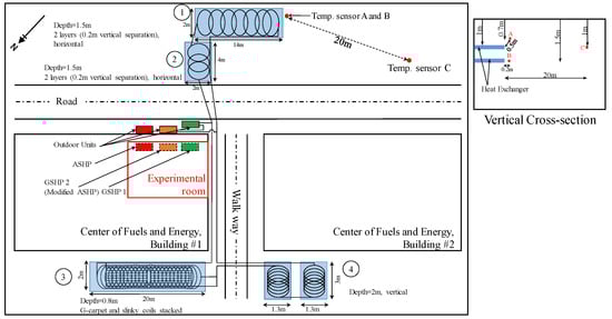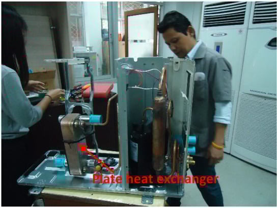 An experimental room (having dimensions of 3 m × 8 m × 2 m) in Building 1 of the Center of Fuels and Energy was used for an operational cooling test. The material of the building’s wall was fiber cement board having thermal conductivity of λ = 0.14 Wm−1K−1 and heat capacity C = 600 Jkg−1K−1 [47]. Three fan coil units (FCUs)—one ASHP and two GSHP (GSHP 1 and GSHP 2) systems—were installed. Both GSHPs use antifreeze solution (40% propylene glycol) as ground heat transfer fluid. The antifreeze solution was used in order to reduce the risk of corrosion. GSHP 1 was a Japanese GSHP with reversible functions for cooling and heating. GSHP 2 was an ASHP, modified by changing the original heat exchanger with a plate heat exchanger (Kaori-K050X22, 7.03 kW) to allow heat exchange between the R410A refrigerant fluid and ground-loop circulation fluid. Figure 7 shows the heat exchanger replacement work of the modified GSHP. Specifications for each system are presented in Table 1. Both GSHPs were connected in a series to GHEs, as shown in Figure 3. A Graphtec GL240 logger recorded data from the power meter and thermocouples that measured the outdoor, indoor, and circulation-fluid inlet and outlet temperatures at 10-min intervals. For the ASHP, only the power consumption and outdoor and indoor temperatures were recorded. The thermocouples used for measurements are described in Table 2.