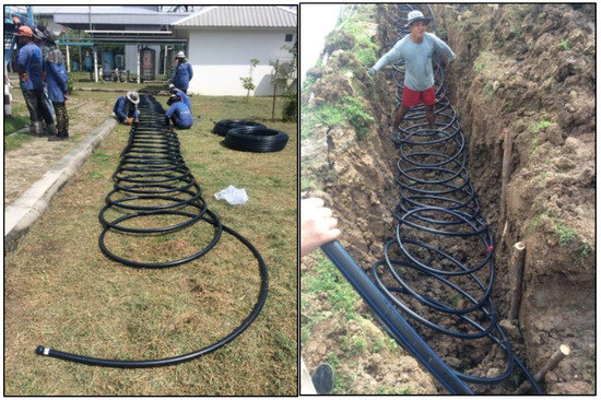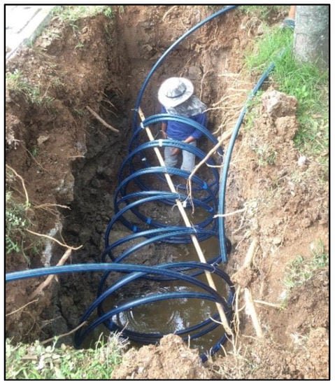 Lastly, in Group 4, two 50-m HDPE pipes in a helical configuration were installed in the bottom of two trenches having dimensions of 3 m × 1.3 m × 2 m (depth). The two pipes were connected in a series. Figure 6 shows the installation of this heat exchanger.