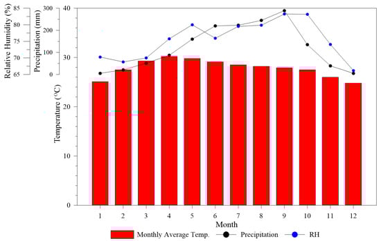 Annual variations of temperature, precipitation, and relative humidity at Saraburi.