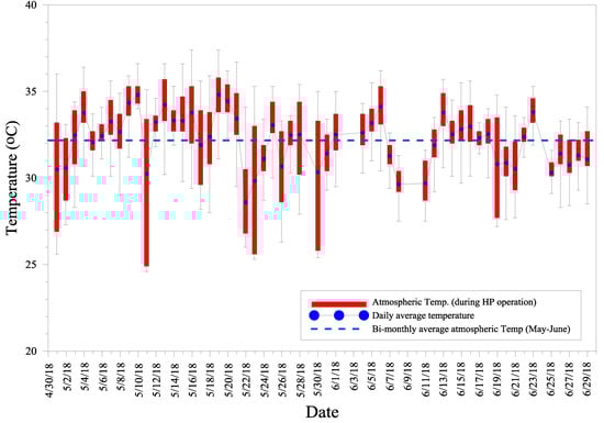 From May to June 2018, GSHP 1, GSHP 2, and the ASHP respectively, operated for 19, 18, and 17 days, with the daily average operational period being 9.6 hours; it should be noted that the start–stop schedule was not fixed at an exact time. The experiment was conducted on a daily basis during weekdays and sometimes during the weekend, in case the experimental room was being used. Apart from the automated logging system, personnel who turned the heat pumps on and off wrote down the start/stop time, as well as the analog energy meter readings in a logbook. The data gathered from the data logger were then cross-validated against the logbook data. The room temperature was set at a constant 25 °C for all heat pumps. The average heat exchange circulation flowrate of GSHP 2 was 11.56 L/min (= 1.92 × 10−4 m3/s), owing to the low-capacity circulation pump, in contrast to 22.27 L/min (= 3.71 × 10−4 m3/s) for GSHP 1. Figure 10 shows the variation in the outdoor temperature during the operational time. Average operational temperatures were 32.4 and 31.9 °C for May and June, respectively.
