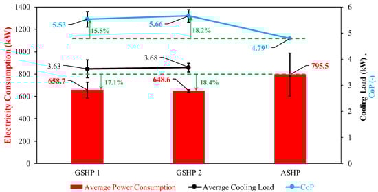 Performance comparison of the GSHPs and ASHP; the coefficient of performance (CoP) of the ASHP is calculated assuming an average cooling load similar to that of GSHP 1 and GSHP 2.
