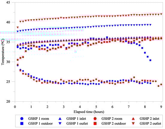 Figure 15 compares temperature data of GSHP 1 and GSHP 2 for similar operational outdoor temperatures (see also Figure 10) on May 20 and May 9, respectively. GSHP 1 operated for 8.33 hours, while GSHP 2 operated for 9 hours. GSHP 2 began operation earlier in the morning, while GSHP 1 stopped operation later in the evening. This can be seen from the low outdoor temperature of GSHP 2 at the beginning of operation, in contrast to the low outdoor temperature of GSHP 1 at the end of operation. The results reveal that the outlet temperature of GSHP 2 was higher than that of GSHP 1, although the operating conditions were nearly the same. The inlet and outlet temperatures of the two systems rose over time, following a similar linear trend. It is interesting that even though the outlet temperature of GSHP 2 was roughly 5 °C higher than that of GSHP 1, the difference in average power consumption for the two heat pumps was not great. From the current standpoint, bearing in mind that the current GHE circulation flow rate was low, a higher flow rate may be considered to increase the performance of GSHP 2.