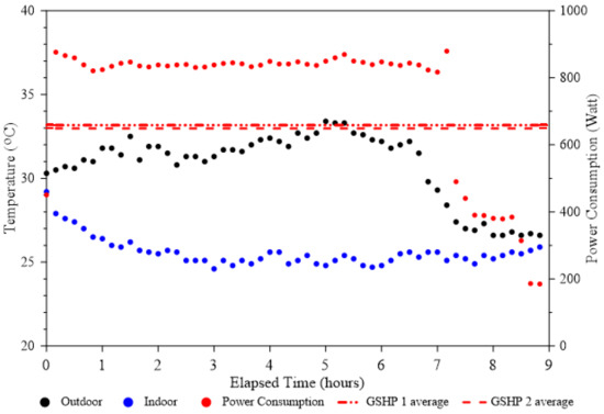 Figure 16 shows the performance of the ASHP. During operation at a high outdoor temperature, the ASHP required a power input higher than the average power consumption of GSHP 1 and GSHP 2. However, as soon as the outdoor temperature dropped below 27.5 °C, after about 7 hours of operation, the power consumption fell below the average value for GSHP 1 and GSHP 2. This temperature range is a turning point, where one may consider that the application of a GSHP has no advantage over the application of an ASHP. There is a close relationship between thermal comfort and occupants’ psychological and physical considerations [49,50,51]. The personal comfort zone may thus be different from the standard definition of thermal comfort [5,8,51,52]. Studies focusing on indoor thermal comfort found that people living in the tropics tend to have an acceptable temperature comfort zone higher than that of ASHRAE standard 55 [5,50,52,53,54,55,56]. Thus, at this temperature, people may require only the circulation of air through the use of a fan to obtain an acceptable comfort level.