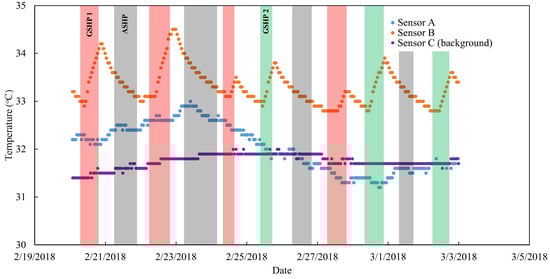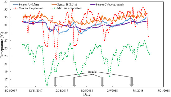 Three ground temperature sensors were installed in the experimental site. Sensor A and B were installed at depths of 0.7 m and 1.5 m, respectively, in a single vertical hole, close to the end of the Group 1 heat exchanger (see Figure 3), with a 60-min sampling interval. Sensor C was installed 20 meters away, to measure the background temperature. However, from middle of March 2018 onward, no data were recorded, due to broken underground wiring. Figure 17 shows the recorded temperatures between 1 December 2017 and 13 March 2018. During this period, a similar intermittent experimental pattern was carried out. Broken lines show the daily maximum and minimum temperatures during the same period. The general trend of the ground temperature could be divided into two periods, i.e., the declining ground temperature before January, followed by the increasing temperature after January. The declining temperature can be observed during December as the average air temperature decreases. During this month, the ground temperature fluctuations, as can be observed from sensors A and B, were lower, due to the fact that the thermal load of GSHP was low, resulting in the low heat rejection rate. It is also clear that the temperatures from all three sensors show that the ground temperatures are close to those of the maximum daily temperature. Temperature fluctuation could be observed from all sensors. Fluctuations shown by sensor C indicated that the ground temperature fluctuations at 1 m of depth, due to the daily variation of air temperatures. A sharp fluctuation pattern can be observed from sensor B, due to the increasing ground temperature followed by the declining temperature during the GSHP’s operation cycle. However, positioned further away from heat exchanger, less fluctuation is observed at position A.