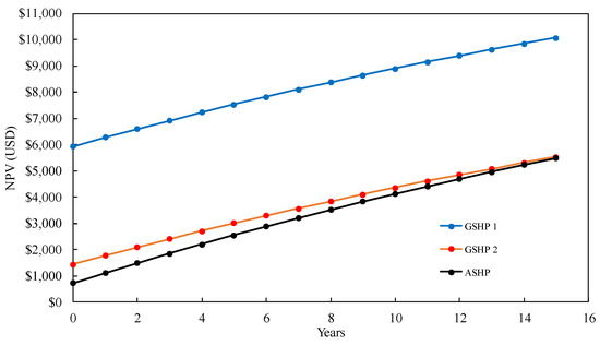 Various economic analyses can be applied to assess the economic value of GSHPs—e.g., present value (PV) analysis, internal rate-of-return analysis, net-benefit analysis, payback analysis, and benefit-to-cost ratio analysis [40]. Noorollahi et al. performed a numerical simulation and economic evaluation using the PV for the application of GSHPs to the energy supply of greenhouses in Iran [41]. The annual cost has been used to evaluate the feasibility of GSHP application in Turkey [42]; it was concluded that the GSHP system is economically preferable to the ASHP system for cooling purposes. Esen et al. [43] conducted a techno-economic assessment of GSHPs for heating in Turkey. Go et al. [44] evaluated the economic feasibility of various configurations of the shallow spiral coil loop heat exchanger, using the PV, internal rate of return, and savings-to-investment ratio. Zu et al. analyzed the economic application of GSHPs in hot and humid climates using the PV [45].