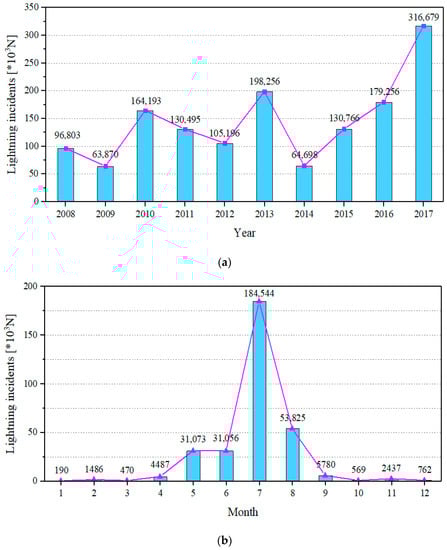 Lightning is a common natural phenomenon mainly occurring within cloud-to-ground and cloud-to-cloud which, however, causes damages to electrical installations, buildings, and humans due to its large current as well as induced transient voltage [1,2,3]. Recently, affected by climate change and global warming, lightning has occurred more frequently compared to previous years. It was reported by the National Aeronautics and Space Administration that the incidence of lightning increases approximately 5%–6% when the global surface temperature increases by 1 °C [4,5]. Figure 1a shows the number of lightning occurrences from 2008 to 2017 in South Korea. The lightning incidence increased significantly from 2014 to 2017, and occurred 316,679 times in total in 2017. From Figure 1b, which shows number of lightning every month in 2017, it can be seen that lightning occurred more frequently from May to August due to the high temperature [6].