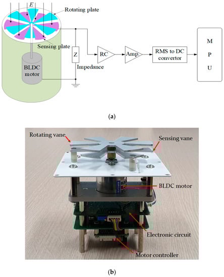 The EFM sensor was used to detect the atmospheric electric field between cloud and ground and to provide an advanced warning before a lightning incident occurs [7,14]. The configuration of the fabricated EFM sensor is shown in Figure 2. It was mainly composed of a sensing plate and a rotating plate that was grounded. Both plates were designed with 6 vanes and were made of aluminum, which were lightweight and anticorrosive. The rotating plate was driven by a brushless direct current (BLDC) motor with a constant speed and, therefore, the sensing plate was exposed and shielded from the electric field periodically, resulting in the charge and discharge of the sensing plate.