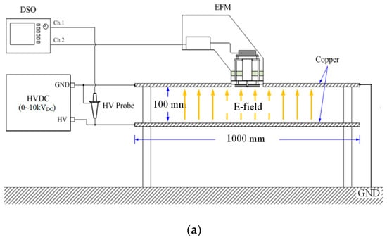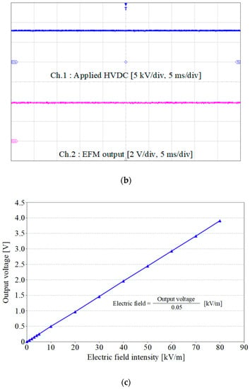 A calibration experiment was conducted to verify the linearity between the input electric field and the output voltage of EFM. As shown in Figure 3a, a high voltage direct current (HVDC) generator with a maximum output of ±10 kV was used to generate electric field between two copper plates. The diameter of the plates was 1000 mm and the distance between the two plates was 100 mm. The edges of the plates were rounded to avoid the distortion of electric field owing to concentration. The EFM was placed at the center of the higher plate to detect the electric field intensity. The output voltages of EFM were recorded by a digital storage oscilloscope (DSO). Figure 3b shows the input high voltage and output signal of EFM sensor. The input electric field and the output of the EFM sensor were 80 kV/m and 3.9 V, respectively. The calibration result is shown in Figure 3c. It can be seen that the designed EFM sensor had a linear response to the input electric field up to 80 kV/m and the detection sensitivity was 48.75 mV/kV/m.