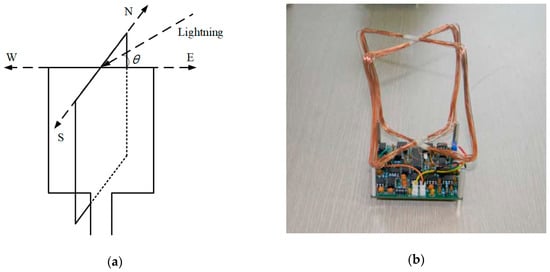 The direction of lightning was estimated by a pair of north–south (NS) and east–west (EW) oriented loop antenna, which were perpendicularly placed. As shown in Figure 5a, the ratio of two voltages induced from loop antennas is proportional to the angle θ that can be determined as: