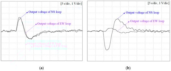 To verify the response of the designed loop antennas, it was used to detect an 8/20 µs, 500 A lightning impulse generated by a surge generator. Examples of waveforms of output voltages are shown in Figure 6. Since the NS loop and EW loop received almost the same amount of magnetic flux when the antenna was placed in the north–east direction, output voltages in Figure 6a had a similar magnitude. On the other hand, the NS loop received more magnetic flux than the EW loop when the antenna was placed in north-south direction, output voltage of NS loop in Figure 6b was higher.