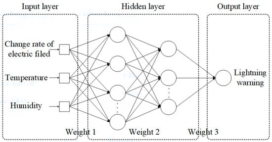 The structure of the neural network is shown in Figure 8. There were three neurons in the input layer, whose values were change rate of electric field, temperature, and humidity. The output layer was the result of lightning prediction. Two hidden layers were used to connect the neurons in the input and output layer. The neurons in different layers were connected by weights, biases, and activation function. The weights and biases were randomly initialized to a small value from −0.2 to 0.2. In addition, a sigmoid function was selected to determine the activation function. The back propagation algorithm was used to train the weights between neurons in each layer by using the 2000 sets of collected electric field, temperature, and humidity. This was made from the forward propagation of input data and back propagation of error. In the forward propagation, input parameters transferred from input layer to output layer without change of weights and biases. By contrast, in the back propagation, errors calculated by comparing actual output and desired output propagate from output layer to input layer with update of weights and biases. The back propagation algorithm continuously operated until the allowable error was less than 0.0001 and then the trained weights were updated in the system for real-time lightning warning [17,18,19]. This intelligent algorithm was developed based on the LabVIEW program with the standard state machine design pattern.