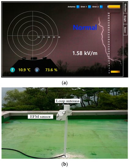 The front panel and installation of the LWS are demonstrated in Figure 9. To evaluate the performance of the proposed LWS, it was used to predict lightning occurrences in six months and the results were compared with these acquired by the loop antennas. Ten data groups of comparison of lightning prediction accuracy between existing and proposed method are shown in Table 1. It can be seen that the existing method failed to predict lightning strike in the data group of 2, 3, 6, and 8. In the data group of 2, 6, and 8, lightning strikes occurred even though the electric filed was below 50 kV/m. In data group 3, a lightning strike did not occur but was incorrectly predicted by the threshold method. However, the proposed method based on the change rate of electric field, temperature, and humidity accurately predicted the 10 cases. During six months, it was verified that 3674 lightning incidents were recorded by the loop antennas; 3449 of them were successfully predicted by the proposed system; whereas only 2453 lightning incidents were accurately predicted by the LWS based on the threshold method.