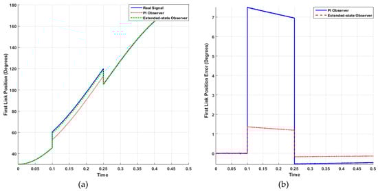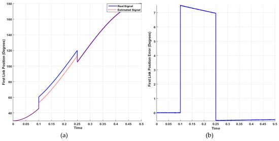 ARX–Laguerre proportional integral (PI) observer method for first-link fault estimation in the faulty condition: (a) Real and estimated output position and (b) estimation error signal.
