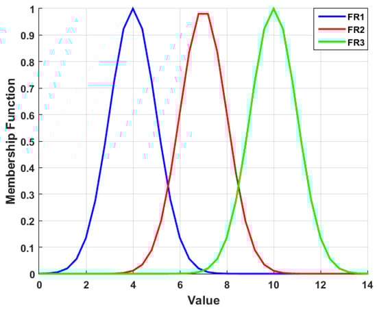 where , and are the fuzzy inputs, fuzzy sets, and fuzzy output, respectively. Therefore, if the fault-tolerant controller is designed as shown in Equation (24) with the adaptive gain tuning technique given in Equation (30) and the online switching gains as determined in Equation (33), the fault-tolerant controller is stable []. For the first fuzzy input in the interval , the fuzzy membership functions are designed based on the Gaussian type, and the fuzzy sets are defined as negative big (NB), negative medium (NM), negative small (NS), zero (Z), positive small (PS), positive medium (PM), and positive big (PB). For the second fuzzy input in the interval , the fuzzy membership functions are designed based on the Gaussian type, and the fuzzy sets are again NB, NM, NS, Z, PS, PM, and PB. For the fuzzy output in the interval , the fuzzy membership functions are designed based on the Gaussian type and the fuzzy sets are PS, PM, and PB. The fuzzy rule table is given in Table 1.