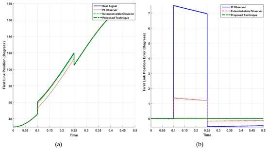 where , and are the PI observation-based state function, the PI observation-based position output, the PI observation-based faults and uncertainties estimation, and the PI observer (proportional and integral) coefficients, respectively. Figure 3 illustrates the effectiveness of the PI observer for fault estimation in the first link of the robot manipulator. As shown in Figure 3, the error in the faulty signal estimation of the PI observer is not good enough for accurate fault estimation and identification.