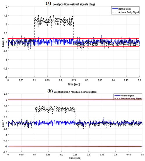 The threshold value formulation is extracted from Equation (14). Sliding mode is a robust algorithm that can be used to design a robust controller and observer. In this study, we used this technique to calculate threshold values []. In the first step, the residual signal is calculated based on Equation (13). In the second step, the sliding surface is calculated to find the robust surface for each condition. We use an integral term of sliding surface to calculate the threshold value based on a steady-state residual signal. The residual signal and threshold values for various conditions (normal, actuator fault, sensor fault, and actuator–sensor fault) are completely different. In the third step, the switching function is used to find the maximum and minimum signal value for each condition and improve the robustness. In the last step, threshold values are calculated. Thus, based on these threshold values, we can drive the decision logic part for fault detection and identification. Figure 7 illustrates the effect of incorrect threshold values for fault detection in normal and actuator fault conditions. Based on Figure 7a, the uncertainties and disturbances in normal condition are detected as faults and send an incorrect fault alarm to the fault-tolerant controller. In Figure 7b, based on the threshold value, the proposed method cannot detect the faulty signal.