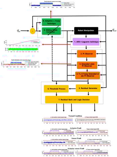 Algorithm 1 illustrates the adaptive T–S fuzzy sliding mode extended-state ARX–Laguerre PI observer for fault detection, estimation, identification, and tolerant control of a robot manipulator. Figure 8 illustrates the proposed method as a block diagram for fault diagnosis and fault-tolerant control.