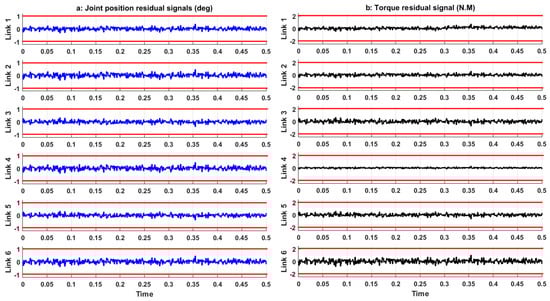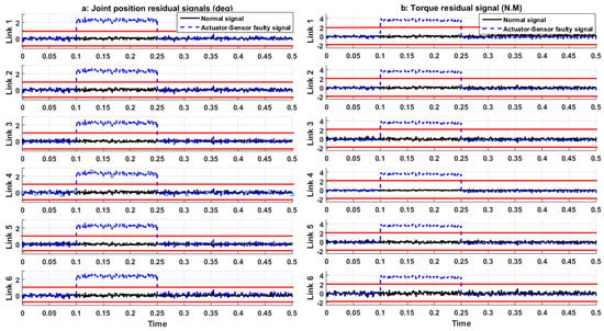 Residual signals in the actuator–sensor faulty condition: (a) Joint variable residual signals and (b) torque residual signals.