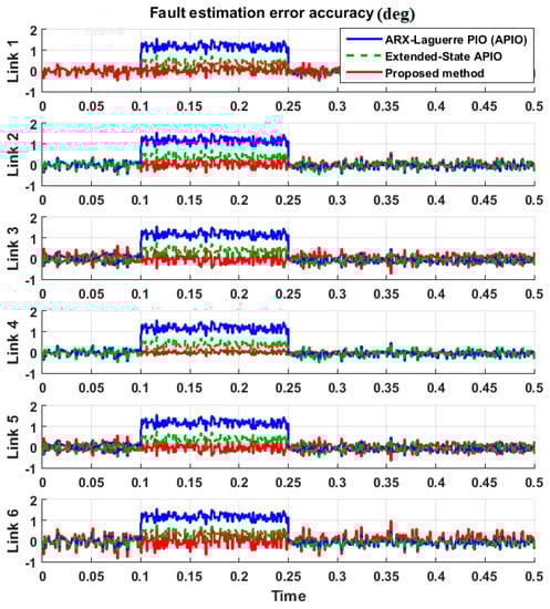 Figure 14 shows the effect of actuator–sensor faults on the joint position and torque residual signals. The proposed T–S fuzzy extended-state ARX–Laguerre PI observer is used for actuator–sensor fault detection, estimation, and identification, and it detected the actuator and sensor faults in all links.