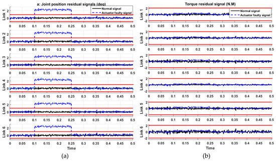 Residual signals in the faulty actuator condition: (a) Joint variable residual signals and (b) torque residual signals.