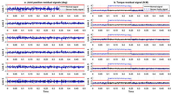 Residual signals in the sensor faulty condition: (a) Joint variable residual signals and (b) torque residual signals.
