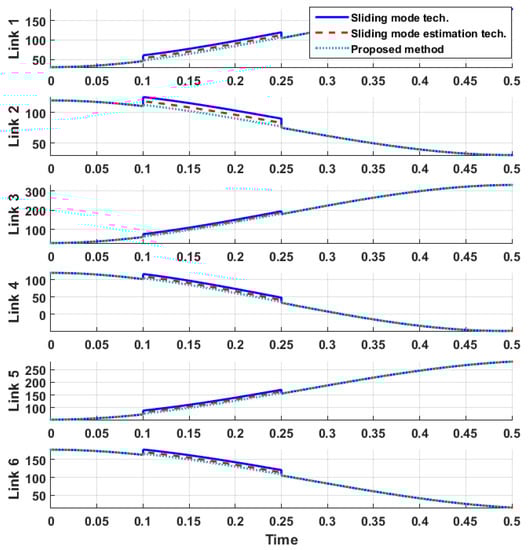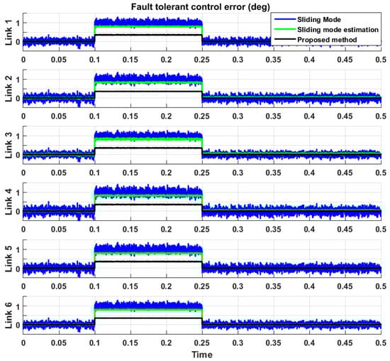 After detecting, estimating, and identifying the actuator and sensor faults using the proposed T–S fuzzy sliding mode extended-state ARX–Laguerre PI observer algorithm, we evaluated the performance of the proposed fuzzy adaptive sliding mode estimation algorithm, the sliding mode estimation algorithm, and the classical sliding mode procedure for fault-tolerant control using a 6-DOF PUMA robot arm. Figure 15 illustrates the trajectory and power of the proposed fault-tolerant algorithm, sliding mode estimation algorithm, and classical sliding mode algorithm for fault attenuation. As shown in Figure 15, the power of fault attenuation in the proposed technique is better than that in the sliding mode estimation and conventional sliding mode methods. Figure 16 shows the power of three types of fault-tolerant controllers, such as the proposed algorithm, sliding mode estimation method, and classical sliding mode technique, for fault attenuation in a faulty robot manipulator. As shown in Figure 15 and Figure 16, the adaptive fuzzy sliding mode estimation technique is the best to mitigate the level of the fault.