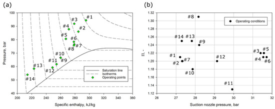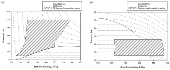 Selected operating conditions: (a) the motive nozzle conditions on the R744 pressure-specific diagram; (b) the pressure ratio in terms of the suction nozzle pressure.