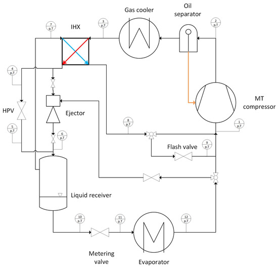 The P & ID diagram of the R744 transcritical cycle equipped with the two-phase ejector.