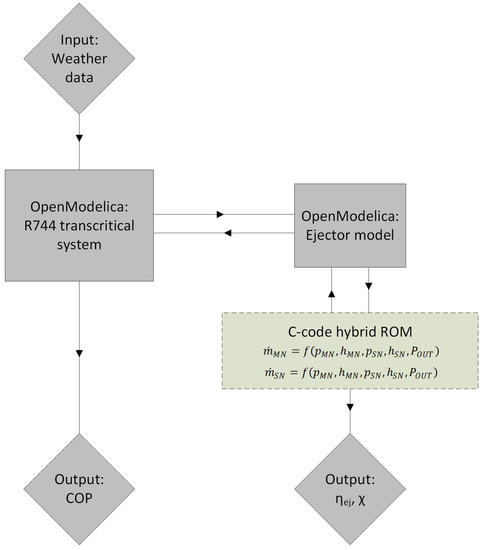 Figure 4 presents the flowchart of the computation procedure of the R744 transcritical system at a single time step. The global input data is a weather data to evaluate system work at different test campaigns, i.e., daily or annual. The object-oriented system solved the governing equations for all considered components. The object-oriented ejector model is combined with the C-code hybrid ROM using external functions. Hence, the motive nozzle and the suction nozzle mass flow rates were reached by calling the hybrid ROM at defined input parameters. Based on the input parameters and results given by the hybrid ROM, the ejector model computed continuously the ejector efficiency and the mass entrainment ratio. Finally, the COP value of the investigated system was calculated.