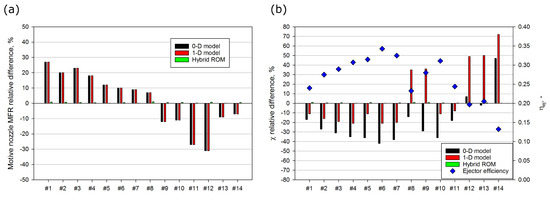 The 0D model using a constant value of ejector efficiency obtained a motive nozzle MFR discrepancy from approximately % under subcritical conditions to 27% under transcritical conditions. The suction nozzle MFR accuracy of the 0D model was in the range from approximately % to 36.5%. As a result, for the MFR predictions of both nozzles, the relative difference of the mass entertainment ratio varied from % to over 47%.