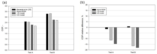 The energy performance of the R744 system based on different two-phase ejector models under the operating conditions given by Banasiak et al. [33]: (a) coefficient of performance (COP); (b) COP accuracy.