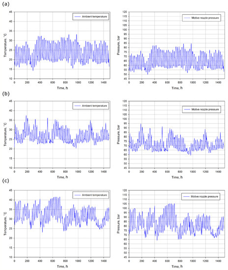 The implementation of the object-oriented two-phase ejector hybrid ROM to the R744 refrigeration system also allowed dynamic simulations of the ejector-based system for different ambient conditions and cooling demands. Moreover, detailed information about the ejector performance during continuous utilisation was observed. Dynamic investigation of the R744 refrigeration system equipped with the two-phase ejector was completed in three different regions characterised by different ambient temperature ranges: Mediterranean zone (measured in Naples, Italy), South America zone (measured in Rio de Janeiro, Brazil) and South Asia zone (measured in New Delhi, India). The weather data were obtained from the free open-source EnergyPlus platform [37]. The analysis was performed during the summer campaign over a period of two months, which is equivalent to approximately 1488 h. Moreover, the dynamic simulations were done with a time interval of 60 s to evaluate the reaction of the system’s operating conditions to the ambient variation.