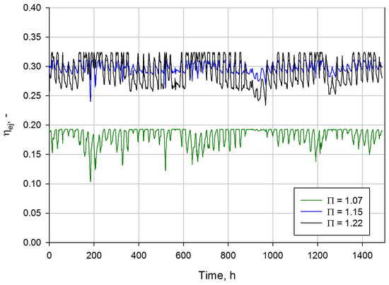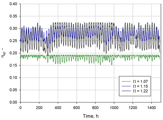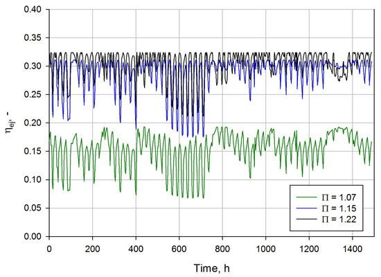 Figure 9 presents the ejector efficiency for different pressure ratios during the investigation in the Mediterranean region. The lowest pressure ratio of 1.07 was linked to the lowest efficiency of below 0.2 due to the low potential to recover the expansion work. The small value of the pressure ratio caused the ejector to be more stabilised and the efficiency variation was approximately 0.03. An increase in the pressure ratio increased the oscillations of the ejector performance. However, the two-phase ejector with the pressure ratio of 1.15 resulted in an ejector efficiency in the range from approximately 0.22 to below 0.31. The efficiency drop was reached after approximately 300 h as the effect of the significant ambient temperature decreased up to 15 C. The highest efficiency of the two-phase ejector of approximately 0.33 was obtained for pressure ratio of 1.22. However, the ejector efficiency dropped down to 0.19 following a decrease in the motive nozzle pressure. Hence, the pressure ratio should be related to the ambient conditions and the cooling demand to maintain the high efficiency during temperature decrease.